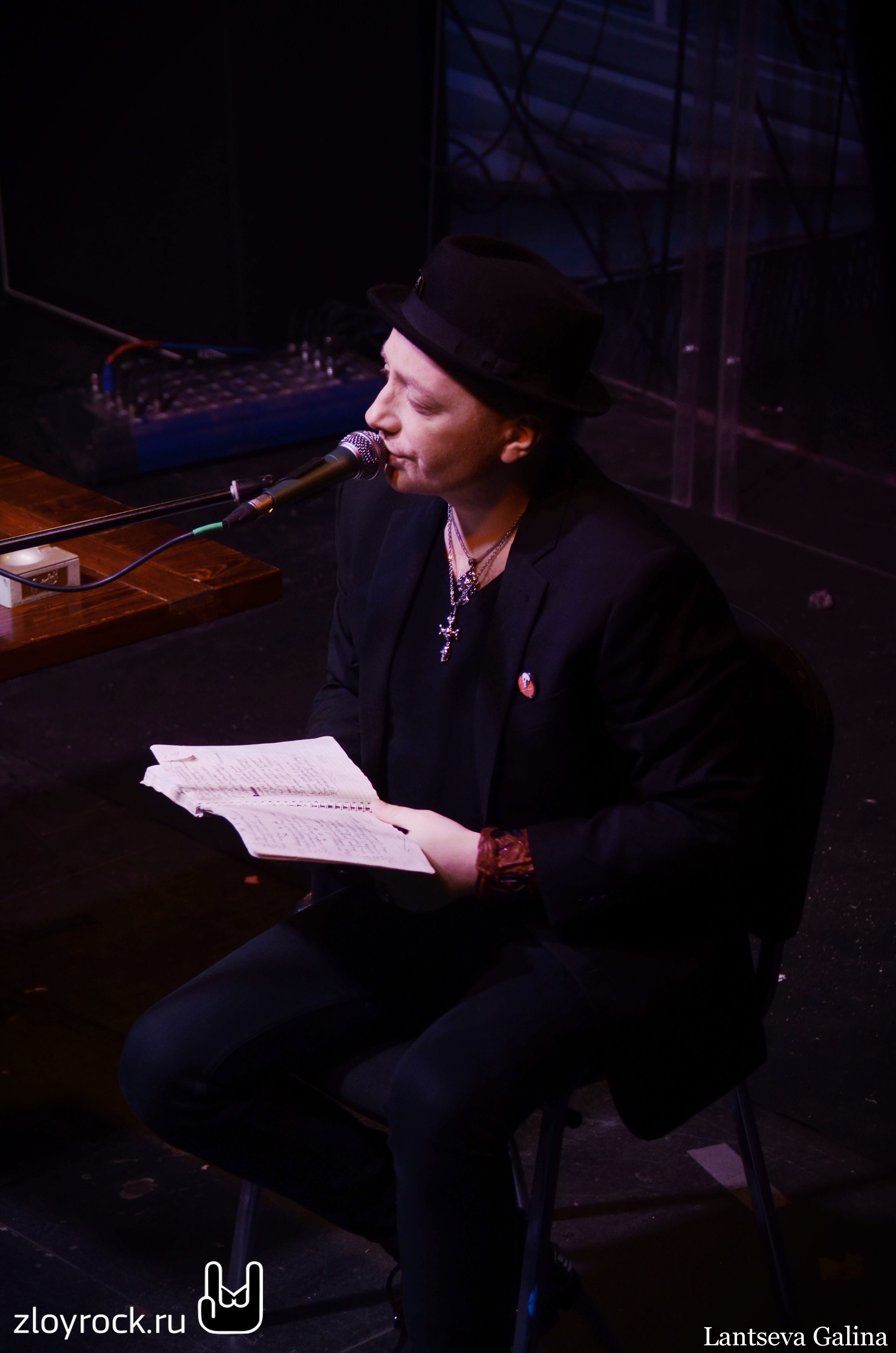 У Глеба хорошее настроение: он шутит и улыбается. Сольник музыканта — это уникальная возможность задать интересные вопросы легенде рока. Глеб Рудольфович сидя на стуле, в черном пиджаке, курит сигареты и в уютной атмосфере клуба Brooklyn, словно у себя дома, никуда не торопясь, легко и непринужденно ответил на вопросы поклонников. Глеб развеял сомнения слушателей о том, имеет ли он страницу в vk, ответив, что таковой у него нет. Не стал рекламировать сигареты, которые курит, и, тем не менее, задавший этот вопрос мог немного приглядеться и увидел бы название известной марки белыми буквами на красном фоне сигаретной пачки, лежащей тут же на столике около тетрадки со стихами.