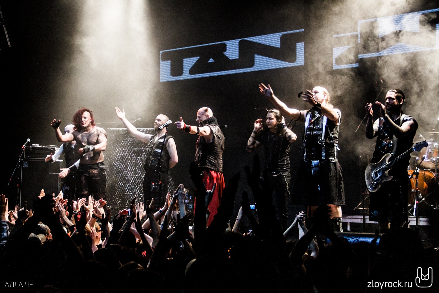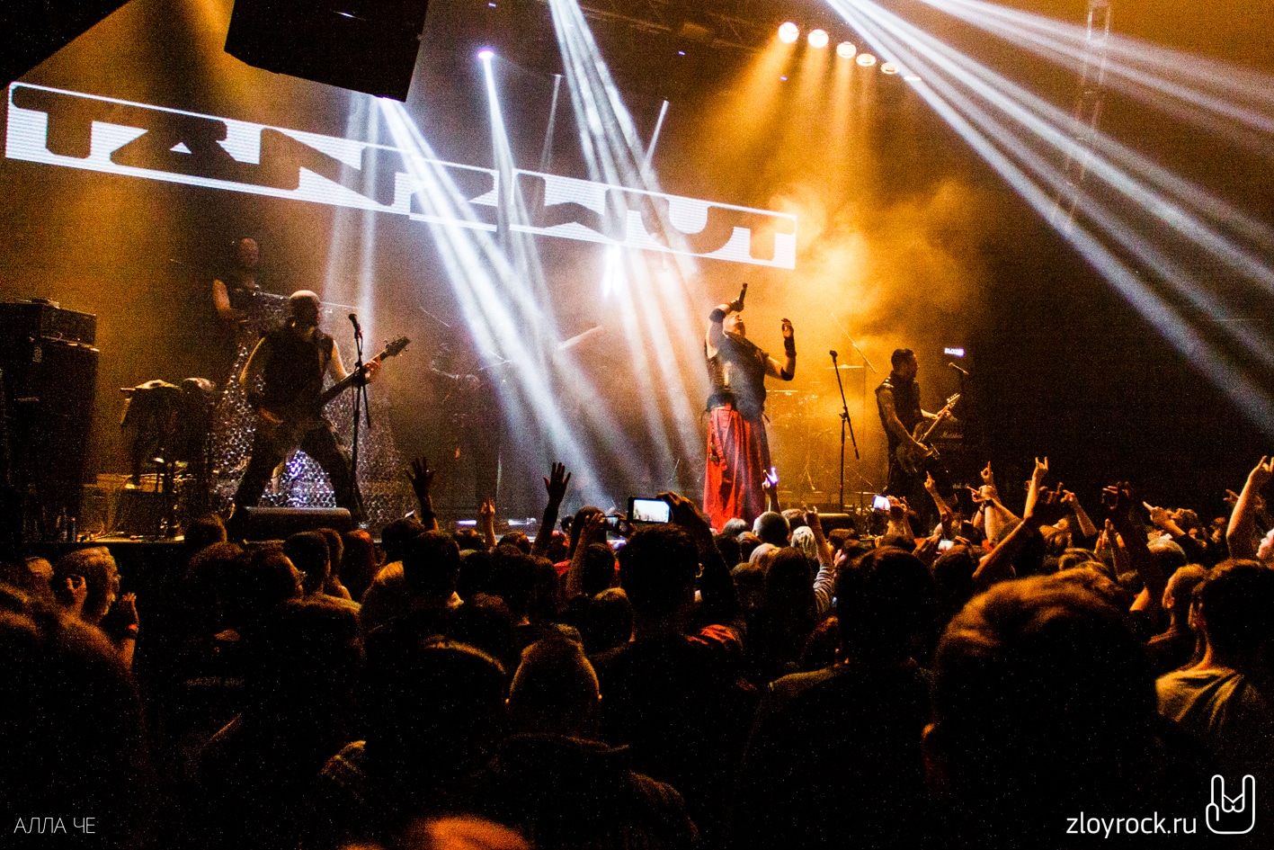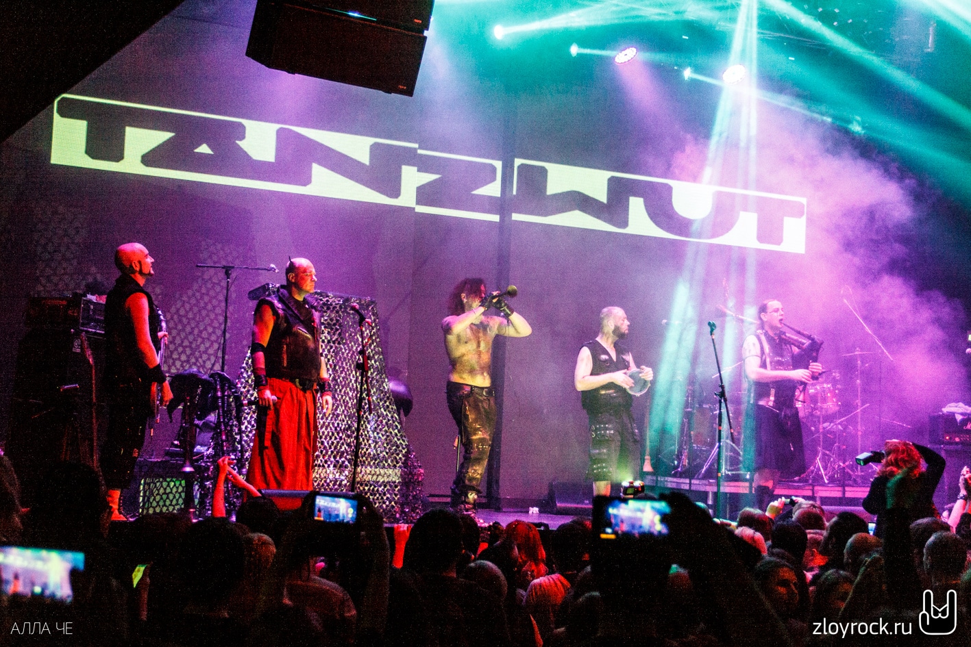 После того, как MORDOR ушли, а техники подключили инструменты TANZWUT, свет в зале погас. На сцене появились семеро участников группы. Pyro и Thrymr вышли, держа в руках волынки. Согласитесь, довольно необычный инструмент для метал-группы. Но кроме них музыканты используют ещё шалмей и драмшайт. Вместе с ударными, гитарами и волынкой музыка звучит средневеково и индустриально одновременно. При этом возникает и желание потанцевать. Дико повезло тем, кто оказался в первых рядах. Вокалист Teufel общался с залом на протяжении всего концерта. И несколько раз протягивал свою руку к фанатам, чтобы те прикоснулись к загадочному немцу лично и поверили, что всё происходящее — чистая правда. В трек-лист концерта вошли и песни из нового альбома Freitag der 13 (2015), звучание которого стало более фолковым с элементами индастриала. Народ прыгал и вскидывал козы и под старые и под новые песни. Teufel говорил «спасибо», «Москва» и пел на русском языке «Нет, нет». В завершение концерта неугомонная толпа всё-таки вызвала группу спеть на бис. Металисты спели Lügner и Arzt, поклонились и помахали своим поклонникам. Казалось, что они не выйдут на бис второй раз. Несколько слушателей поторопились в гардероб, но очень знакомые строки популярной русской песни «Катюша» вернули всех ушедших обратно в зал. Такая интерпретация песни под звуки волынок — это экзотика. Tanzwut явно не хотели прощаться с русской публикой и долго не уходили со сцены, Teufel не унимался и говорил в микрофон: «Ещё, ещё!» и «Катюша» звучала ещё пару раз.