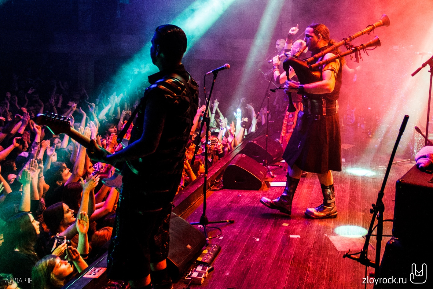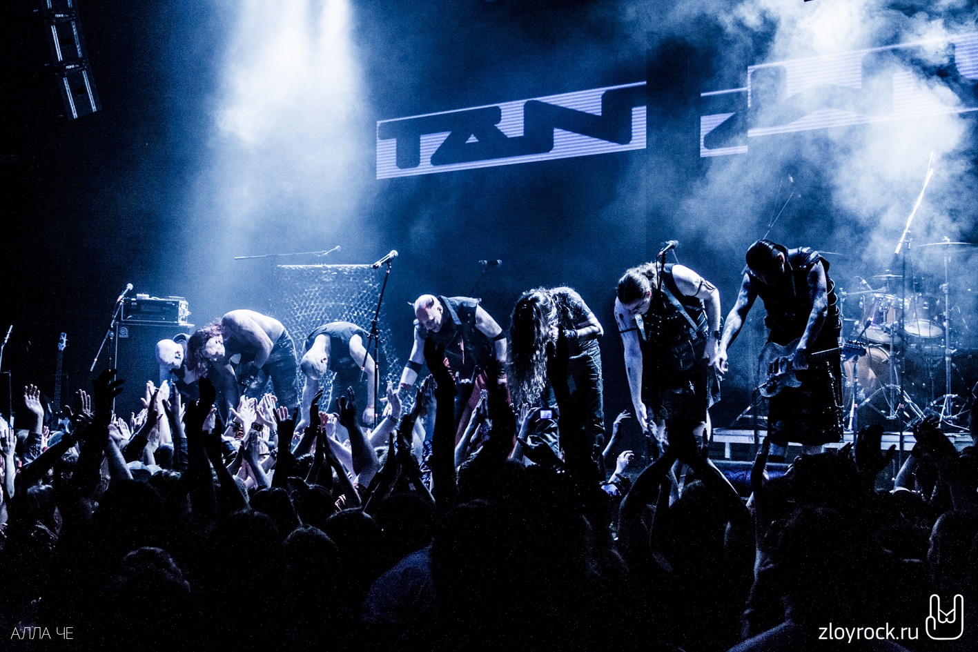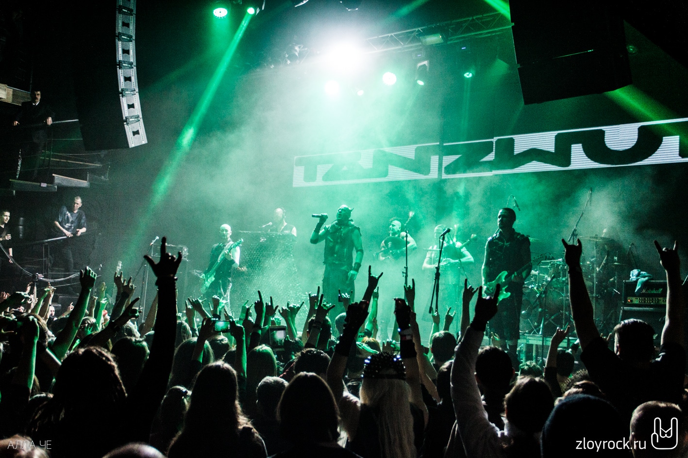 После того, как MORDOR ушли, а техники подключили инструменты TANZWUT, свет в зале погас. На сцене появились семеро участников группы. Pyro и Thrymr вышли, держа в руках волынки. Согласитесь, довольно необычный инструмент для метал-группы. Но кроме них музыканты используют ещё шалмей и драмшайт. Вместе с ударными, гитарами и волынкой музыка звучит средневеково и индустриально одновременно. При этом возникает и желание потанцевать. Дико повезло тем, кто оказался в первых рядах. Вокалист Teufel общался с залом на протяжении всего концерта. И несколько раз протягивал свою руку к фанатам, чтобы те прикоснулись к загадочному немцу лично и поверили, что всё происходящее — чистая правда. В трек-лист концерта вошли и песни из нового альбома Freitag der 13 (2015), звучание которого стало более фолковым с элементами индастриала. Народ прыгал и вскидывал козы и под старые и под новые песни. Teufel говорил «спасибо», «Москва» и пел на русском языке «Нет, нет». В завершение концерта неугомонная толпа всё-таки вызвала группу спеть на бис. Металисты спели Lügner и Arzt, поклонились и помахали своим поклонникам. Казалось, что они не выйдут на бис второй раз. Несколько слушателей поторопились в гардероб, но очень знакомые строки популярной русской песни «Катюша» вернули всех ушедших обратно в зал. Такая интерпретация песни под звуки волынок — это экзотика. Tanzwut явно не хотели прощаться с русской публикой и долго не уходили со сцены, Teufel не унимался и говорил в микрофон: «Ещё, ещё!» и «Катюша» звучала ещё пару раз.